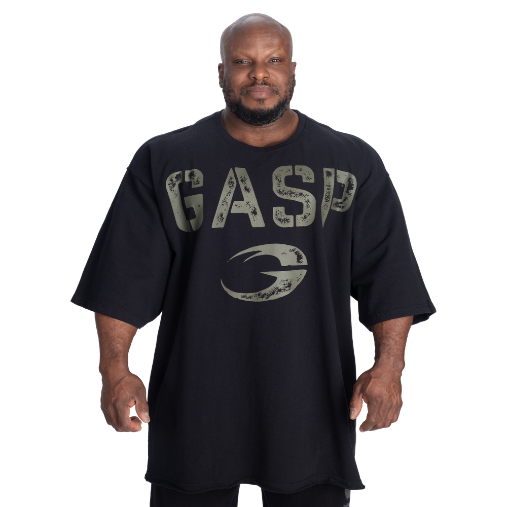 Designed with an oversized fit and full length, it creates a powerful look that moves with you through every lift. The non-PVC soft base GASP print across the chest gives it a worn-in, authentic look, while the woven sleeve label adds a subtle premium detail.