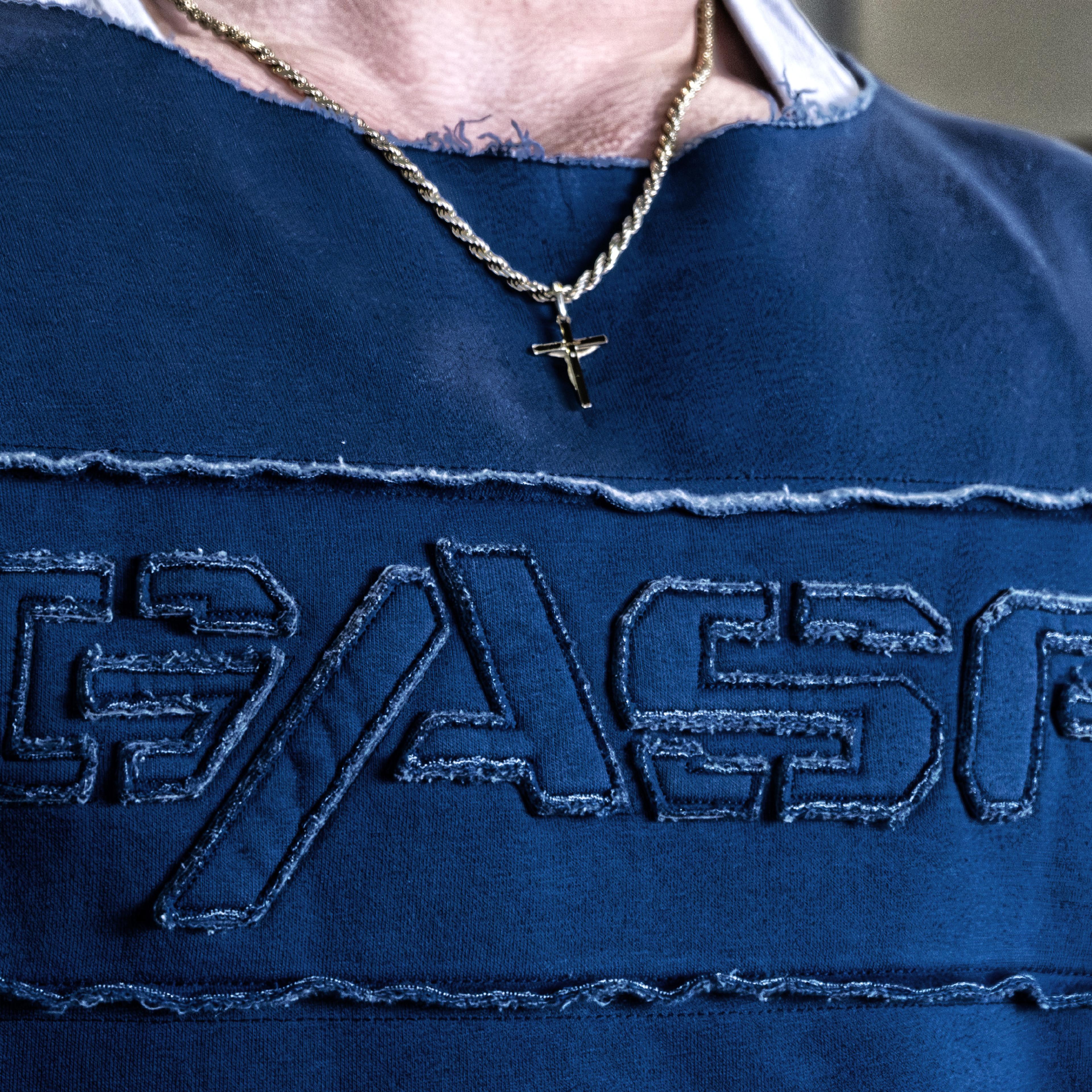 Features: Oversized Iron Tee fit, heavy fabric, raw cut edges, wide neckline, sewn-on chest panel with GASP application and woven sleeve label.